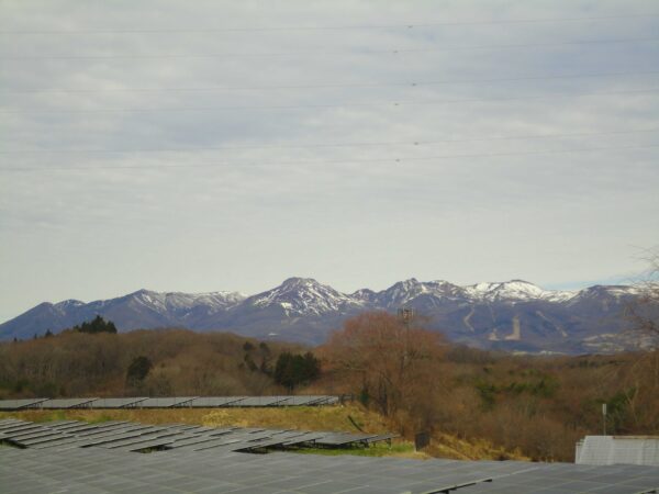 温度を少し下げています。桜の木がほんのりピンク色に那須連山との絶景が今年も