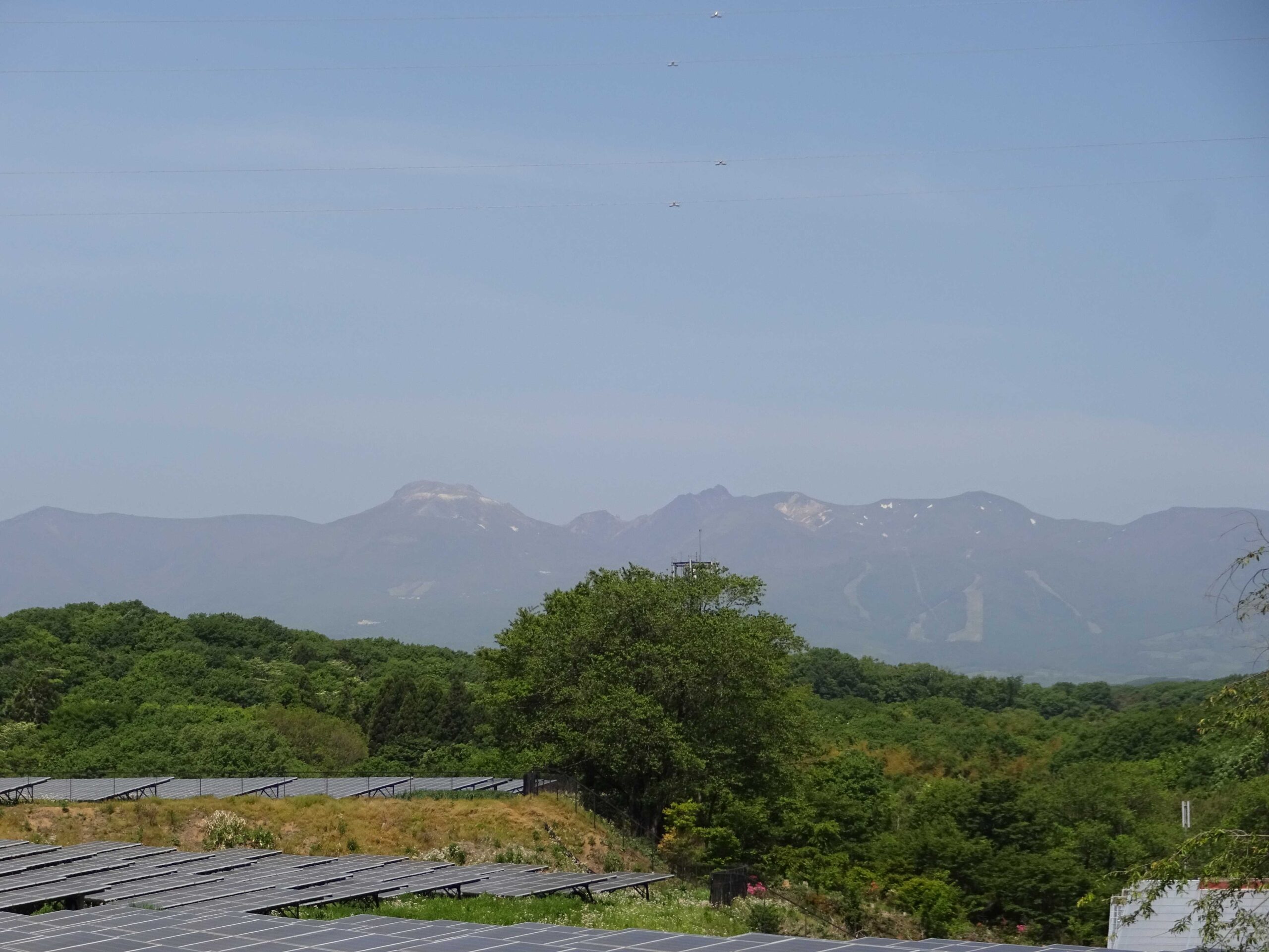 5月18日(木)ぬるい空気で霞んで見える那須山、空は白っぽく。AM9:46 25℃
