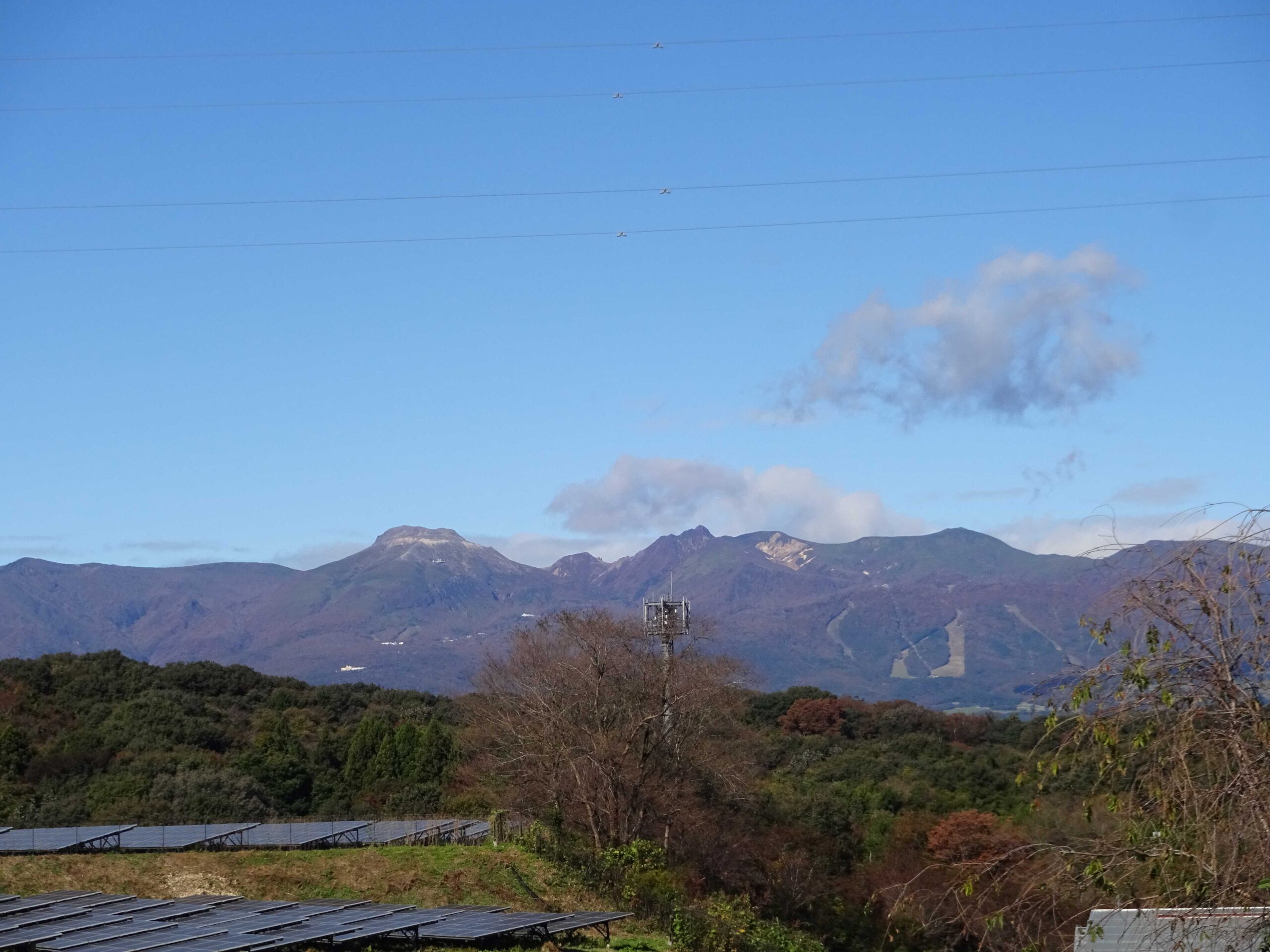 真っ青な空に雲が浮かんでいます。那須山はしっかり見えていまが、紅葉の帯が