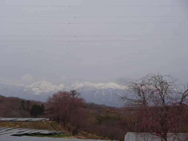 4月10日(木) 那須山を借景に手前の桜は赤くなって来ています。AM9:00 9℃