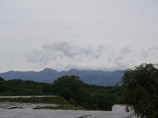 5月26日(月)肌寒い空気、踊るよう雲が漂う那須山濃緑の中にも残雪が。AM9:11 14℃