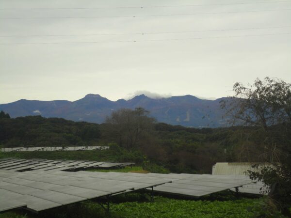 10月19日(日)曇り空ならではの那須山の姿、紅い帯が山肌を横断中。AM9:21 15℃