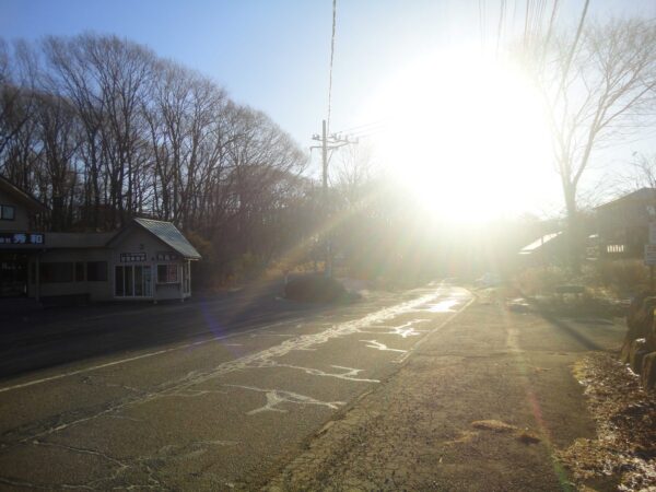 昨日の朝とは違い雲が無く青空が広がっています。道路の雪は残っておらず、日影の